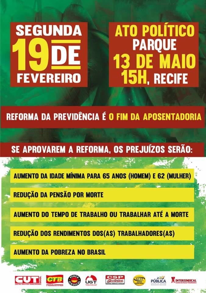 O Sindfort-PE convoca os trabalhadores de sua base para o Ato Público contra a Reforma da Previdência, que acontecerá na segunda-feira,19, a partir das 15h, na Praça 13 de Maio, Boa Vista, no Centro do Recife/PE. A manifestação é uma das atividades da Paralisação Nacional chamada pelas centrais sindicais para pressionar o Congresso Nacional a não votar a Proposta de Emenda à Constituição (PEC) 287, que altera o sistema previdenciário brasileiro.