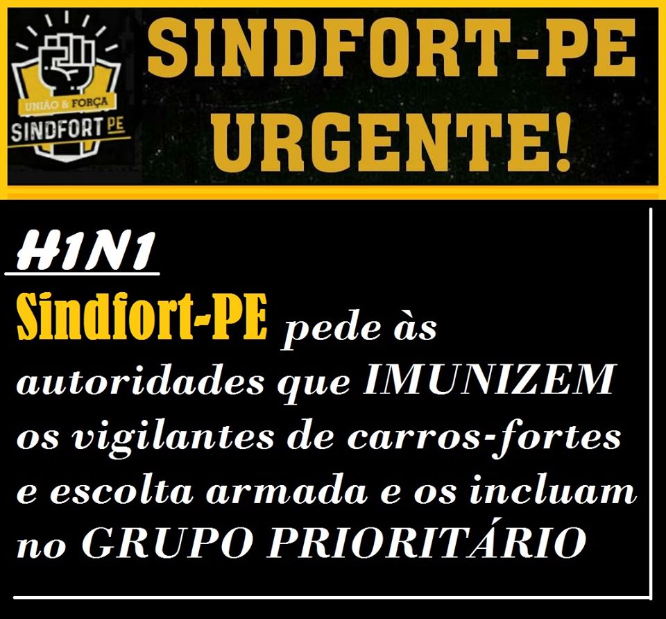 O Sindicato dos Vigilantes e Empregados de Empresas de Transportes de Valores e Escolta Armada do Estado de Pernambuco (Sindfort-PE) faz um apelo às autoridades de saúde no Estado para que os seguranças de carros-fortes e escolta armada sejam incluídos no grupo prioritário para receber vacina contra gripe H1N1, que começa em todo país, na próxima segunda-feira, 23.